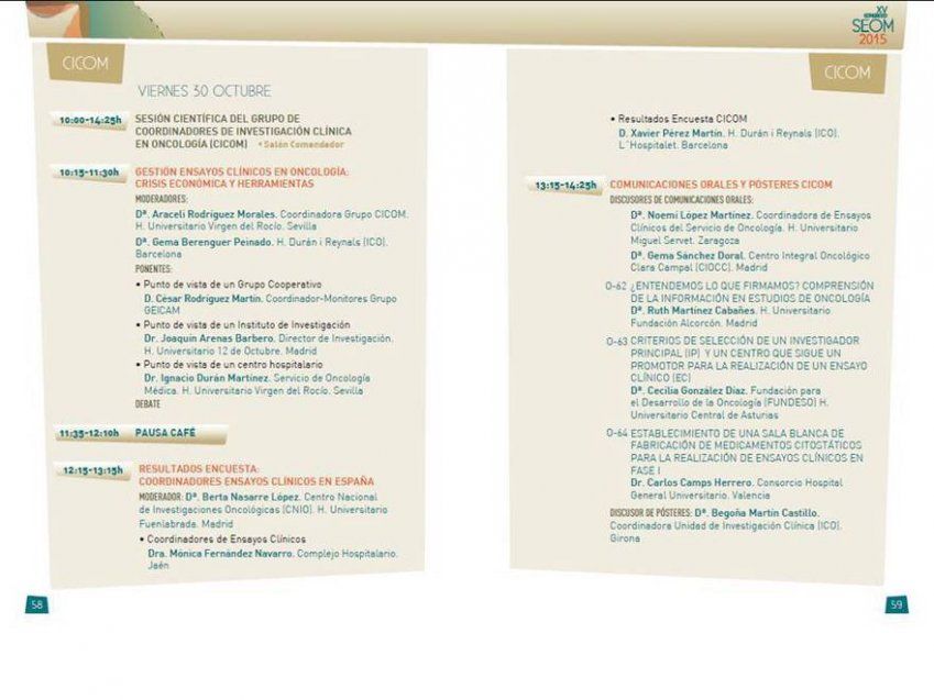 El 30 de octubre de 2015 tuvo lugar la sesión científica del grupo de coordinadores en investigación clínica en Oncología (CICOM) en Madrid, dentro del marco del XV Congreso de la Sociedad Española de Oncología Médica (SEOM). La Unidad de Ensayos Clínicos de Oncología Médica del Hospital Universitario Central de Asturias participó en dicha sesión con una comunicación oral titulada: “Criterios de selección de un investigador principal (IP) y un centro que sigue un promotor para la realización de un ensayo clínico (EC)” y un póster titulado: “Memoria de actividad de la unidad de ensayos clínicos (EC) de Oncología Médica (OM), Hospital Universitario Central de Asturias (HUCA), 2010-2014”.